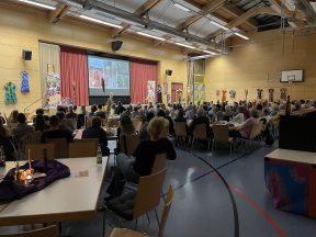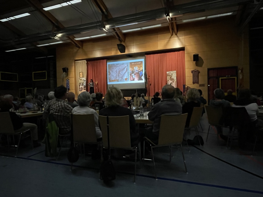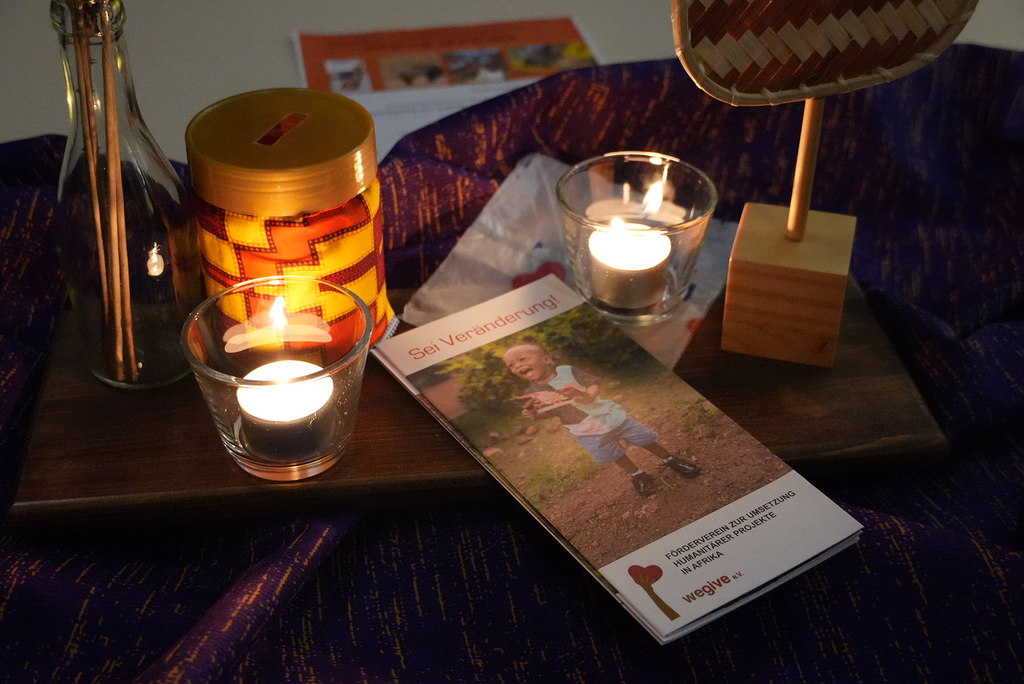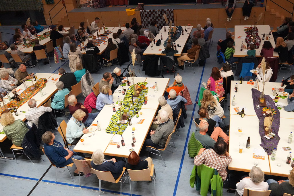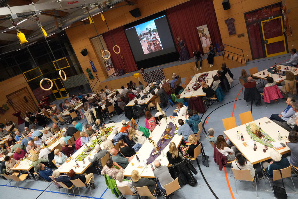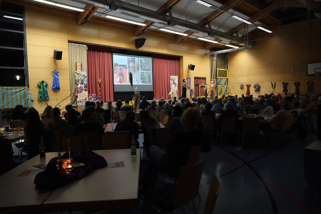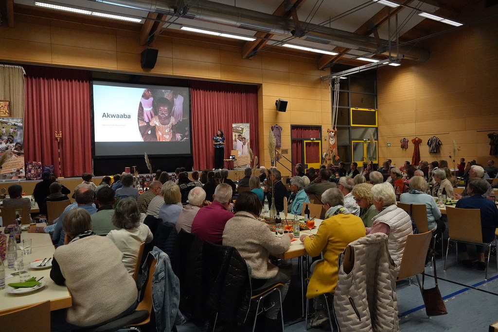 In einer sehr gut besuchten Helfensteinhalle, bei toller, bunter Atmosphäre, teilte Naemi Rieck ihre Eindrücke, Erfahrungen über Ihre erlebte Zeit in Ghana, insbesondere der Zeit als Lehrerin an der dortigen Partnerschule der Eduard-Mörike-Schule von Blaustein. Berührende und spannende Geschichten, die sie mit Bildern und Videoeindrücke die Reise für die Besucher sehr nachvollziehbar gemacht hat. Mit afrikanischen Nudeln und Getränken war es ein stilvoller Abend mit tollen Menschen. Darüber hinaus war der „Weltladen, Ulm“ mit Produkten aus Ghana vertreten. |